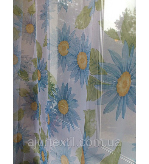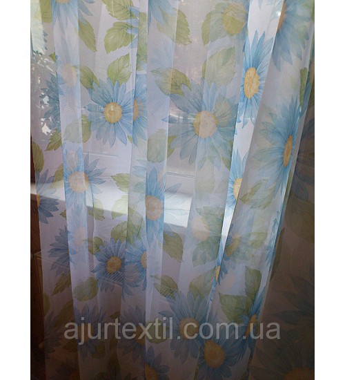 Тюль вуаль.Высота 2,8 м.,набирается ширина, метод нанесения рисунка - печать. Вуаль мягкая, нежная, воздушная ткань. Фон белый, рисунок голубые ромашки