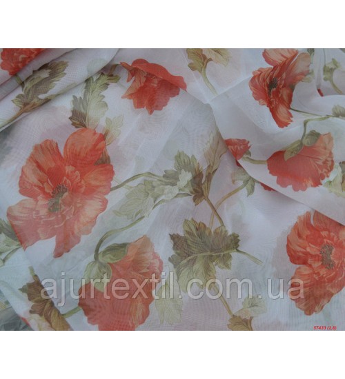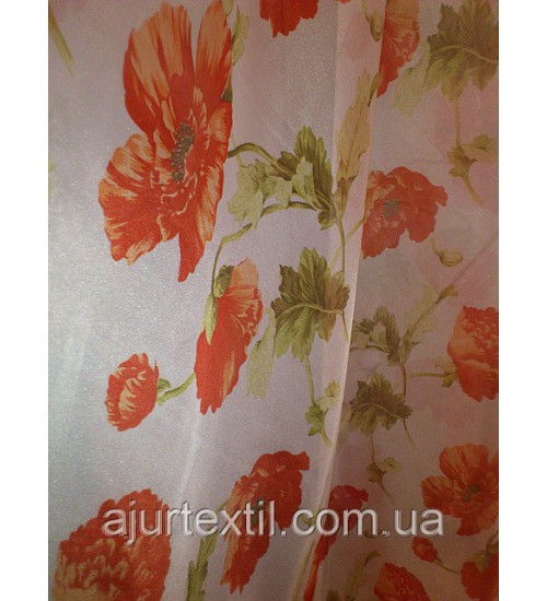 Ткань вуаль. Высота 2,8 набирается ширина, метод нанесения рисунка - печать. Маки яркие, насыщенные-станут украшением любого окна в квартире или доме. Также красиво будут смотреться  тюль печать маки если к ним как декор повесить однотонную вуаль. Вуаль можно подобрать белую или красную, также вуаль можно выбрать к цвету ваших обоев.