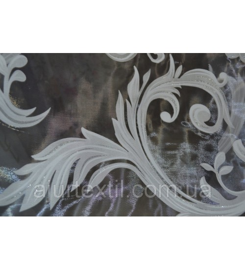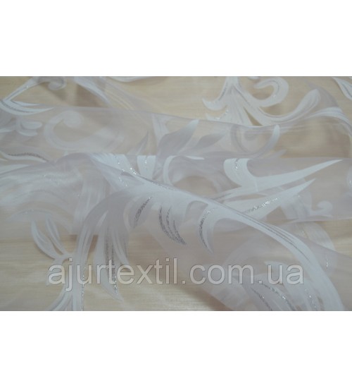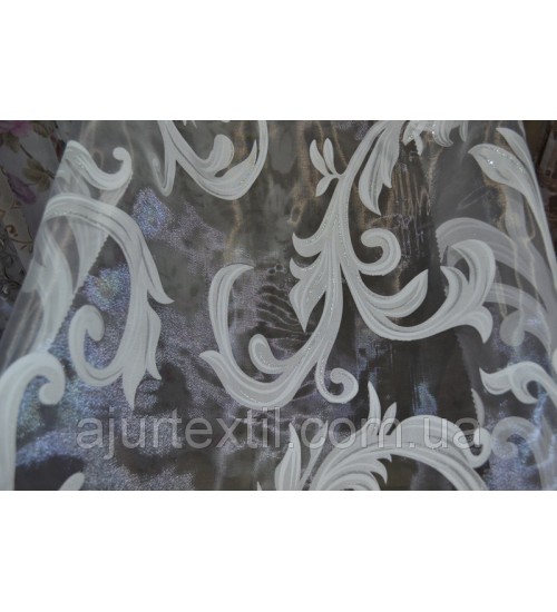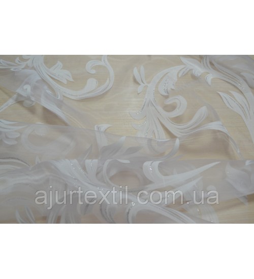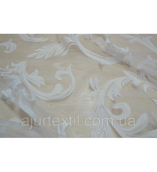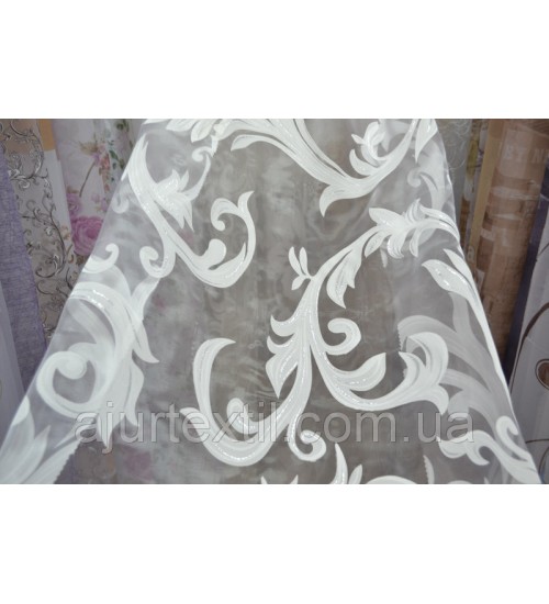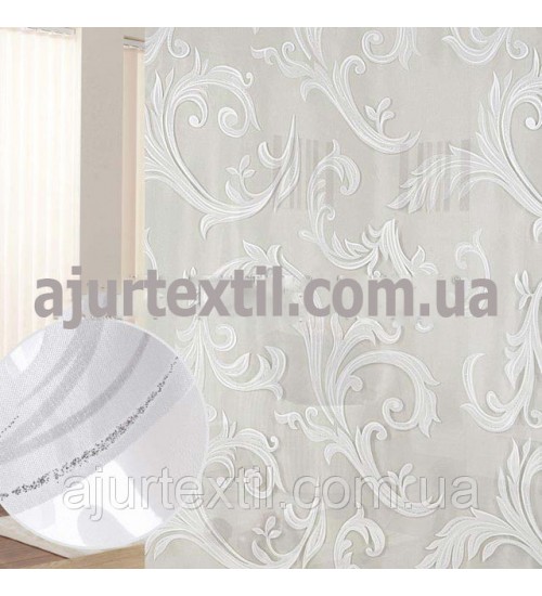 Тюль деворе Нежный вензель. Это шикарная тюль для окна. Вся тюль имеет красивый вензель который имеет нежный почти незаметный блеск. Сами вензеля белые, но на вензелях присутствует нежно серебренный цвет.