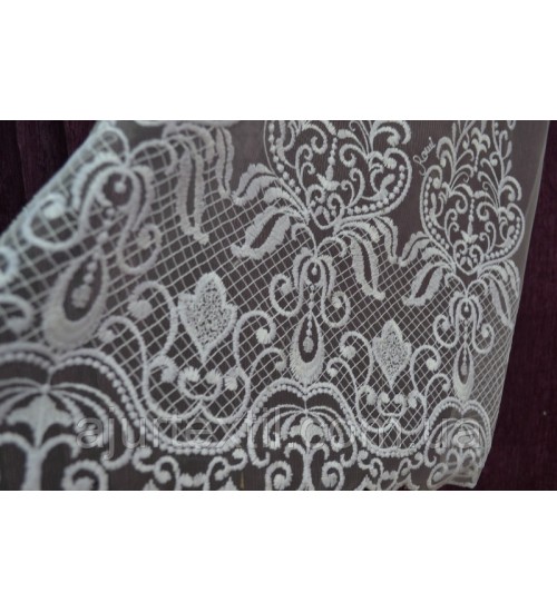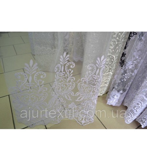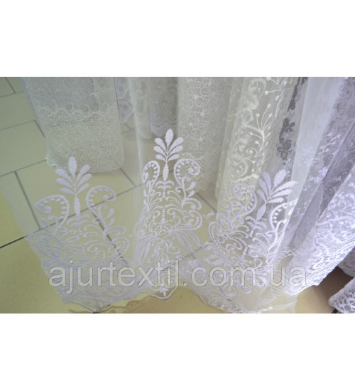 Тюль фатин, высота 2,85, набирается ширина. Тюль белая, верх однотонный фатин, по низу идет нежная вышивка. Производитель тюли Турция.