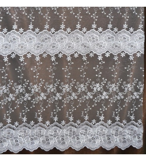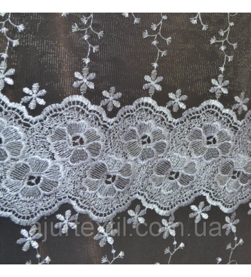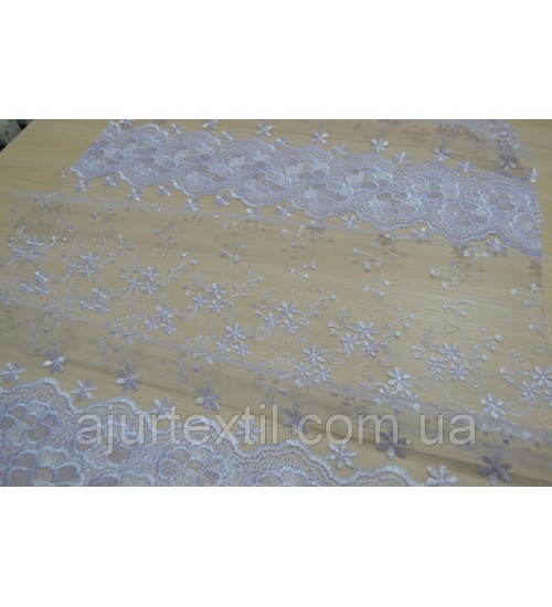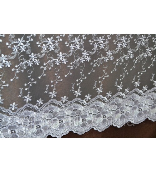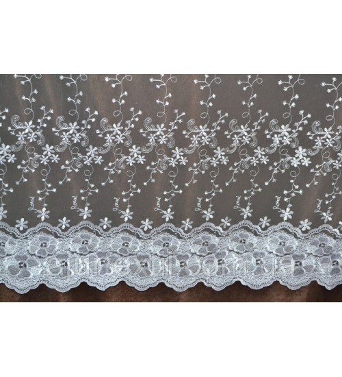 Тюль фатин. Высота 2,9, набирается ширина. Тюль выглядит очень нежной, такая тюль придаст комнате уют, нежность. Цвет белый. Вышивка плотная, красивая. Ажурная вышивка идет  в низу ( ширина вышивки 0,15 см) следующая ажурная вышивка от первой идет на росстоянии 0,35 см, дальше идет красивая веточка с цветочком. Ажурных вышивок на тюли две. В наличии 6 метров