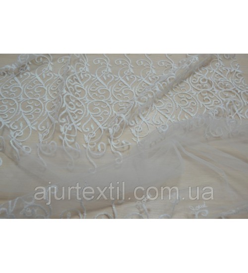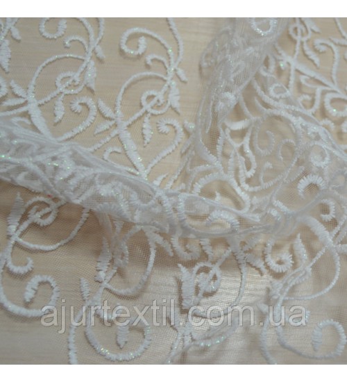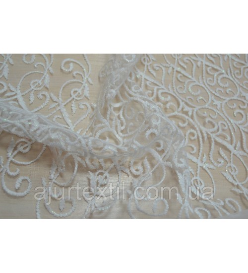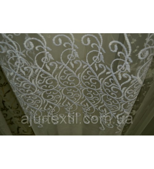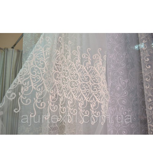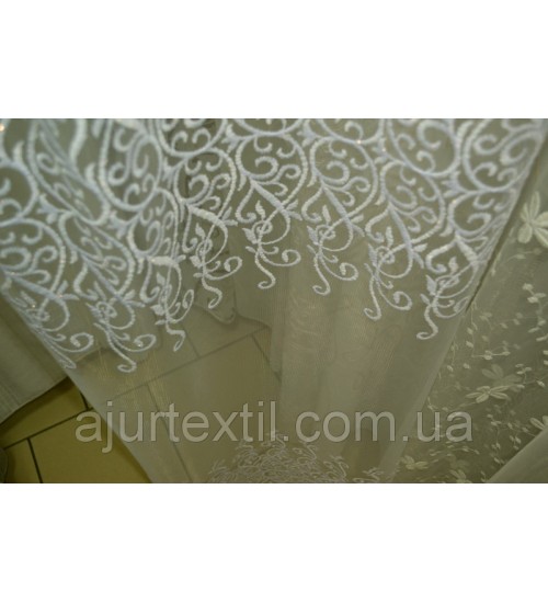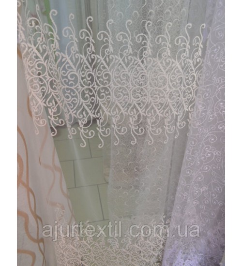 Высота тюли 2.8 набирается ширина. Тюль имеет три поля с красивой, просто шикарной нежной вышивкой. Вышивка идет внизу высотой 35-40 см, после этого однотонный фатин после вышивка 35 см и опять 30 см однотонного фатина и дальше вышивка 35 см и однотонный фатин.