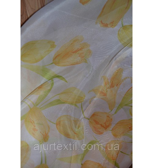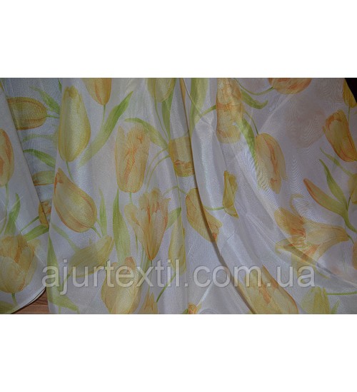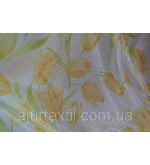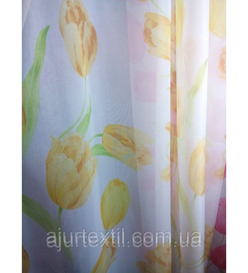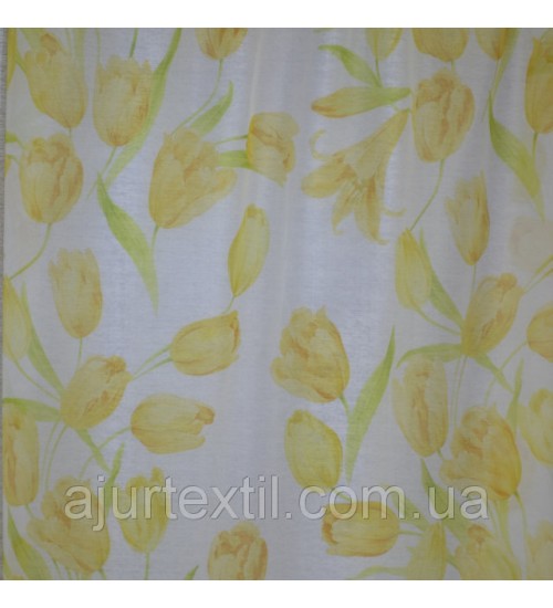 Ткань шифон, высота 2.8 м, метод нанесения рисунка ― печать. Фон тюли белый. Тюльпаны нежно желтые