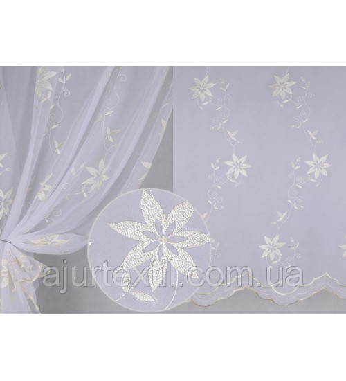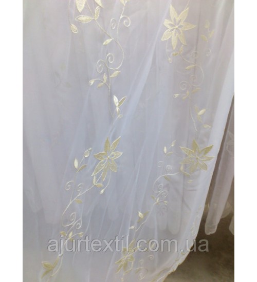 Ткань вуаль, высота 2.8 м., Вышивка на высоту 2 метра. Фон тюли белый. Цветы молочно- золотые